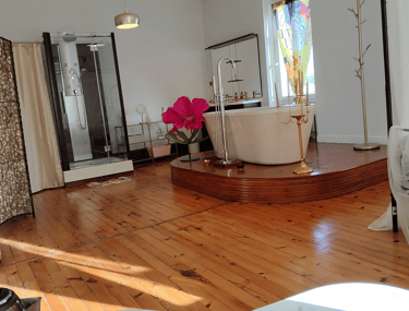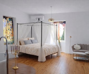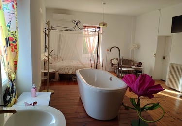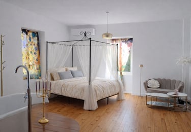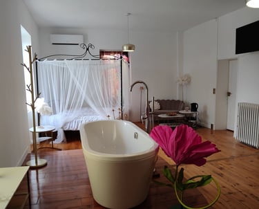 Offrez-vous une parenthèse romantique dans une suite spacieuse et lumineuse de 32 m², avec lit à baldaquin, baignoire, douche, lavabos et WC.