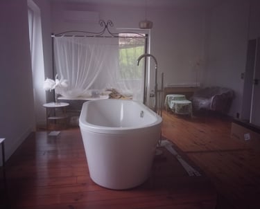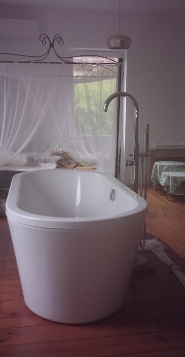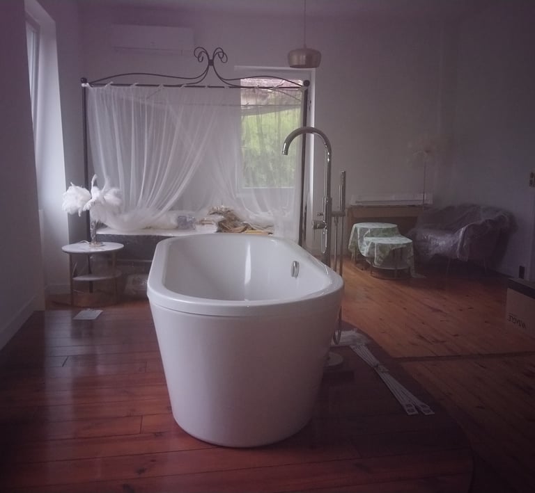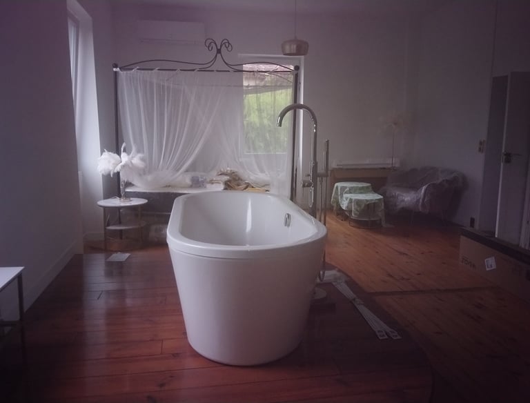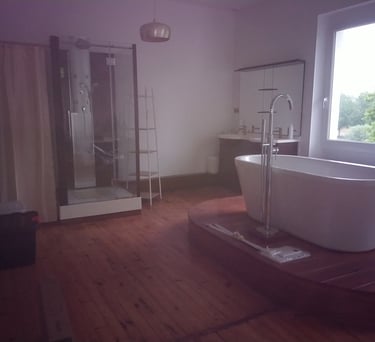 Une suite spacieuse de 32 m² avec un lit à baldaquin et literie neuve, baignoire, douche, lavabos et WC.